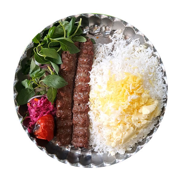 دو سیخ کباب کوبیده گوسفندی ۱۵۰ گرمی، برنج ایرانی درجه یک، گوجه و فلفل کبابی