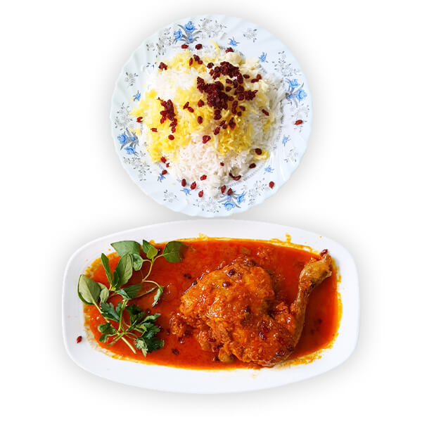 ران مرغ سرخشده با سس غلیظ، برنج زعفرانی و زرشک فراوان